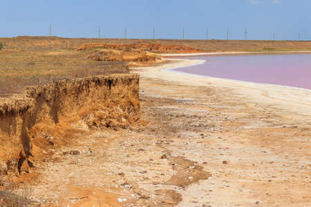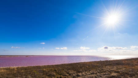 dead salt lake shore under blue sky. Pink salt lake near Azov Sea in Ukraine
