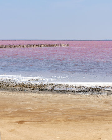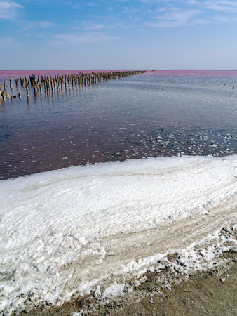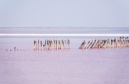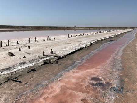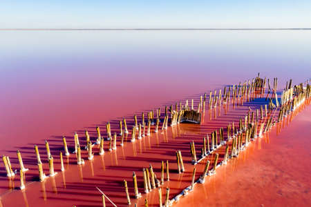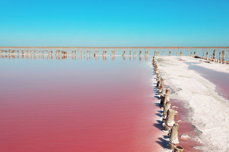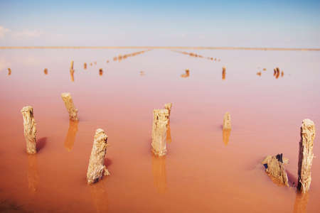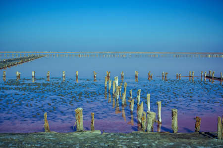 A fantastic pink salt lake with salt crystals on wooden pillars on sunny day, Kuyalnik Liman in Ukraine, Odessa at Summer. Copy space