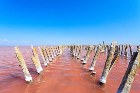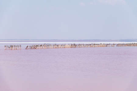 Wooden poles on the pink salt lake Sasyk in the Republic of Crimea, Russia. Sunny day September 27