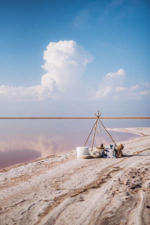 Rose salt lake Sivash. Production of salt, brine, therapeutic mud for spa salons. Ukraine Kherson region village Priozernoe.