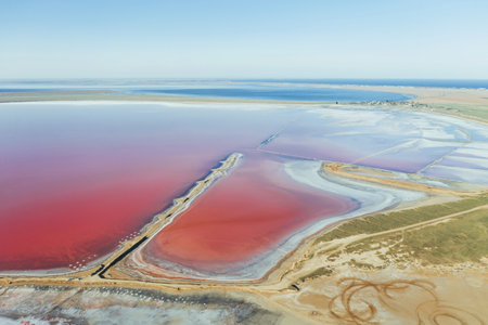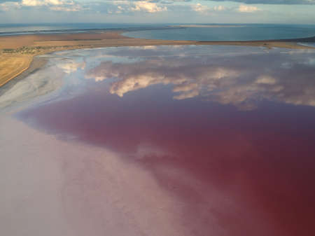 Aerial view of Lake Salt Lake. Red, pink salt water. the largest hypersaline lakes in Ukraine
