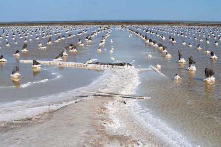 Remains of old wooden platforms for salt extraction on salt lake Baskunchak on a sunny May day. Astrakhan region, Russia