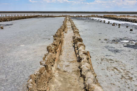 Saline surface and blue sky with clouds. Salt industry on Sasyk-Sivash salt lake in Crimea. Summer landscape