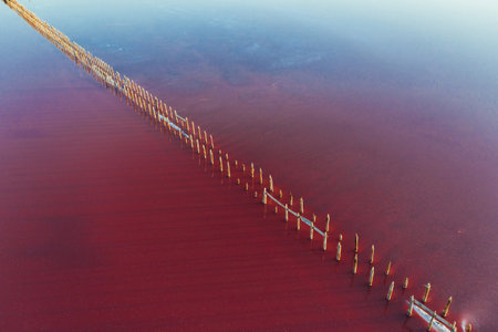A fantastic pink salt lake with salt crystals on wooden pillars stretching away to the horizon. Shooting from a drone. Copy space.