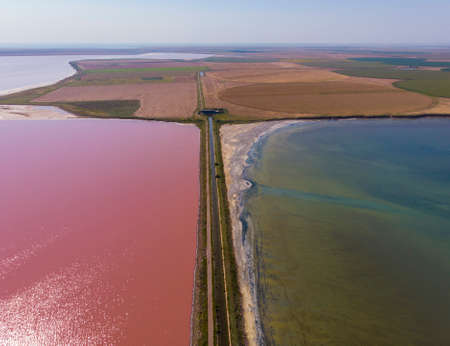 Aerial Drone Shot of a Dam with asphalt Road between Estuaries with Different color of Water. Pink Orange Lake and Green or Blue lake aside a road in Ukraine. Lake Sivash