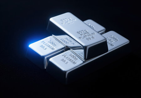 Multiple polished 500 gram pure platinum bars are stacked, reflecting light dramatically against a dark background, ideal for finance and investment concepts.