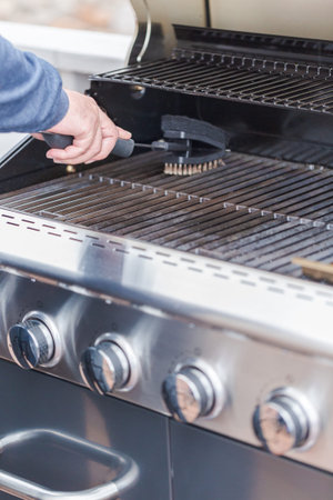 Cleaning outdoor gas grill before next grilling.