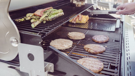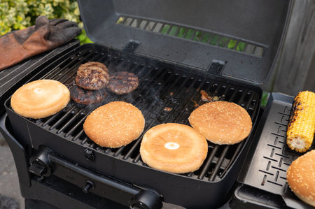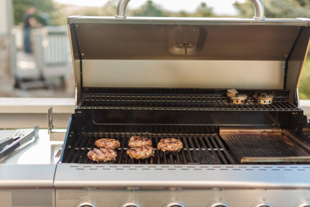 Grilling classic burgers on outdoor gas grill in the Summer.