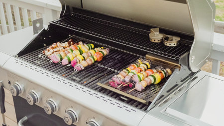 Step by step. Grilling veggie skewers and chicken kebabs on outdoor gas grill.