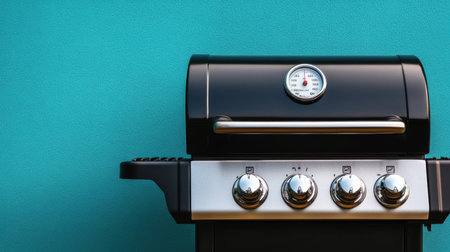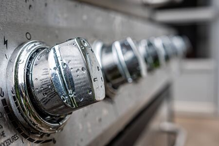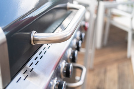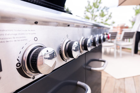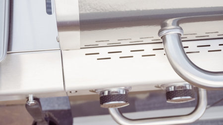 Close up shot of the control knobs on a gas grill with metallic handle. Modern barbeque equipment for roasting meat and vegetables on patio, selective focus