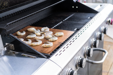 Grilling shrimp on a grill mat over an outdoor gas grill.
