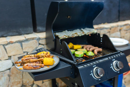 Grilled sausages, skewers, and corn on a plate near a gas barbecue with vegetables and flatbreads cooking. Outdoor summer cooking scene with delicious grilled food.