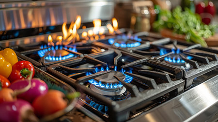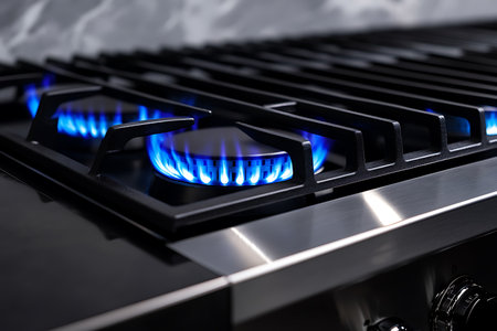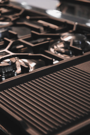 Kitchen gas stove, close up. New gas stove appliance and countertop surface at modern kitchen. Modern kitchen stove cook.