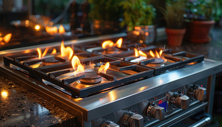 Gas burner symmetry. Flame macro. High-tech kitchen.