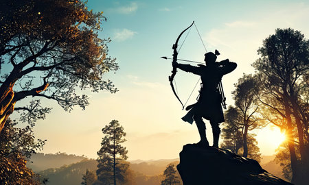A silhouette of an archer drawing his bow and aiming upwards with deep blue sky and white clouds as background