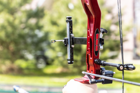 AUCH, FRANCE - MAY 11: Close-up of a hand holding a blue bow at the National tournament for young archers, on May 11, 2013, in Auch, France.