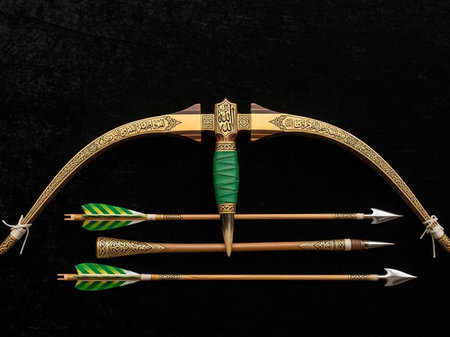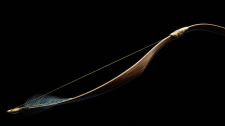 A beautifully crafted wooden bow is showcased with a vibrant feathered arrow resting on its string, highlighting the artistry of traditional archery.