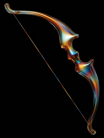 Curved bow with glossy, iridescent surface reflects various colors under light, set against a black backdrop, emphasizing its unique shape and artistry.