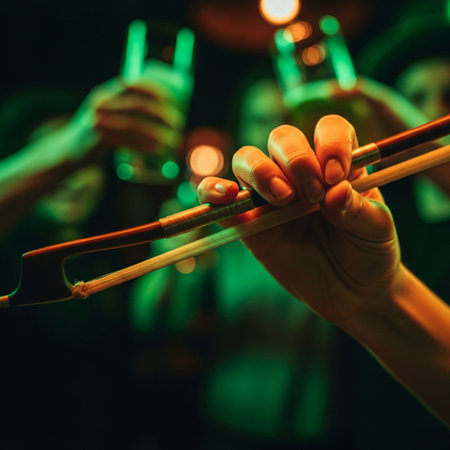 Square 1:1 close-up focusing on the hand of a musician passionately drawing a wooden fiddle bow acro
