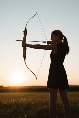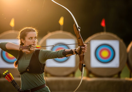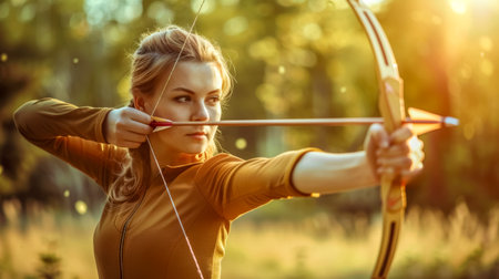 Young woman archer aiming with bow and arrow at target during archery practice in outdoor field with sunlight, showing focus and determination