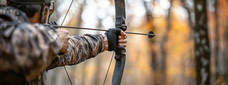 An archer focuses intently while aiming in a serene forest during autumn, capturing the essence of outdoor archery practice