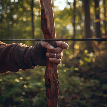 Archer prepares to release an arrow from a handcrafted bow amid tall trees, capturing the essence of traditional archery in a tranquil forest atmosphere.