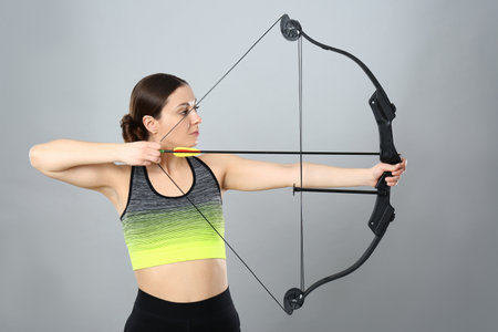 Side view of a concentrated young woman archer aiming with bow and arrow