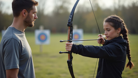 A determined young girl, with braided hair, draws back her bowstring, aiming intently at a distant target while a man observes closely. The scene captures the essence of mentorship and concentration in the sport of archery, set against a serene outdoor backdrop.