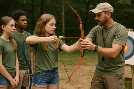 Archery instructor guiding teenage girl aiming with bow and arrow during archery lesson at summer camp, with other students watching