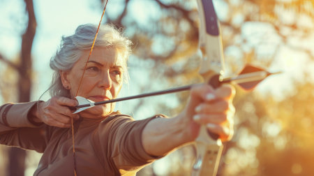 senior woman with bow and arrow aiming archery in autumn park.ai generated