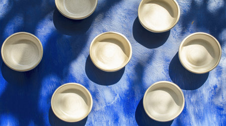 This captivating image features empty round bowls elegantly placed on a vivid blue surface with dynamic shadows and natural lighting, creating a peaceful scene.