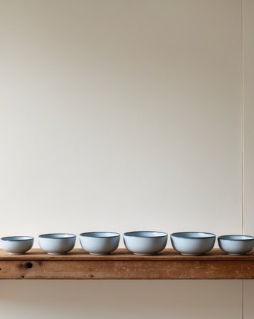 AI Generated. A row of blue and white bowls sitting on top of a wooden shelf