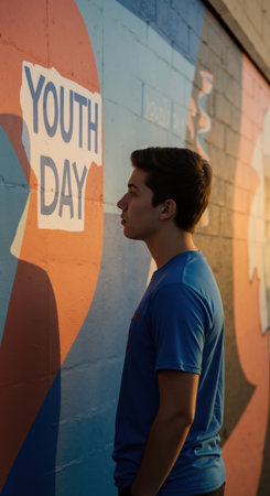 Young man looks at Youth Day graffiti on a colorful wall. Celebration of International Youth Day, generation z concept.