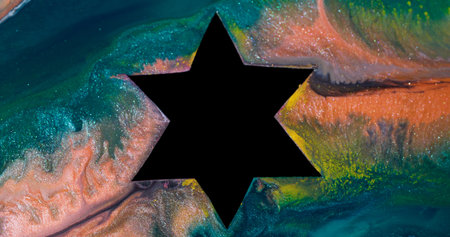 Paint star. Ink water. Defocused orange yellow multicolor black shape frame glitter texture marble spill on abstract art background.
