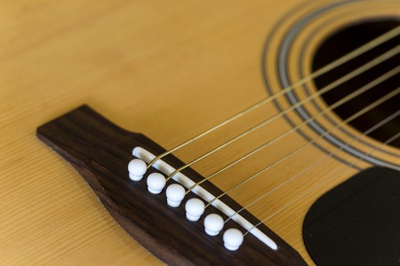 Acoustic guitar bridge with one pins and strings close up with selective shallow focus.