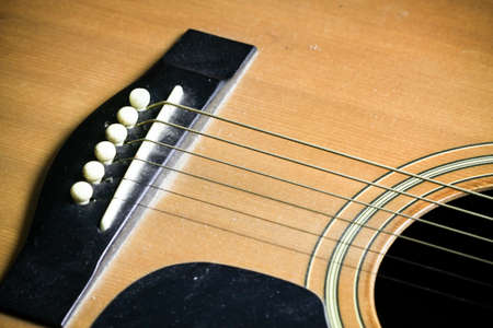 Color horizontal detail of an old, acoustic guitar.