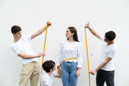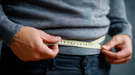 A man using a measuring tape around his waist, showcasing a personal commitment to health and fitness. The image represents body image awareness and lifestyle choices for wellness.