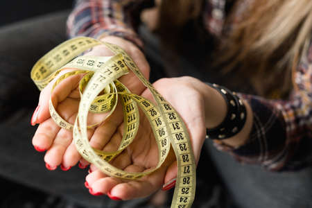 healthy lifestyle. fit body and slim figure. female fight for perfection. losing weight and obesity concept. woman holding measuring tape in hands
