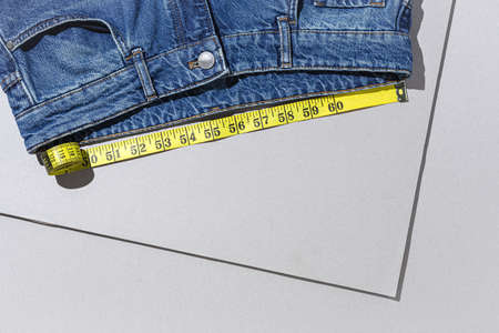 Jeans with measuring tape on light gray background, top view. weight loss concept