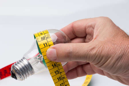 Close-up of rolled up tape measure on number 61. Slim waist and healthy weight concept