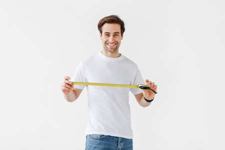 Smiling mechanic, happy carpenter, handyman, builder and work at home. Young handsome man in white t-shirt hold tape-line measure and looking at camera, isolated on white background, free space