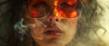 Watercolor-style portrait of a woman smoking with sunglasses and the word RICH in the background. Concept Portrait, Watercolor Style, Woman, Smoking, Sunglasses, Rich, Background, Artistic Portrait