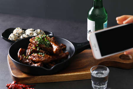 Soju drink and Korean finger foods, chicken feet with rice ball