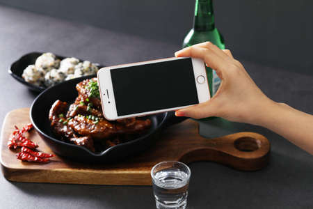 Woman taking a photo of grilled sausages. Woman hand using smartphone to take a photo of dish. Woman taking a photo of delicious food with smartphone at restaurant.