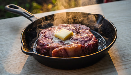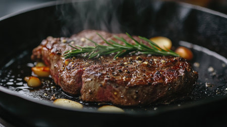 Sizzling steak in a hot cast-iron skillet, with garlic and rosemary, creating a mouth-watering aroma