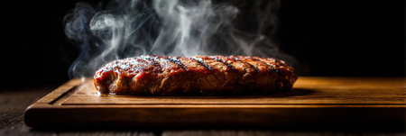 A perfectly grilled steak sits on a wooden board, releasing smoke in a dim environment, showing its tempting texture and flavor.