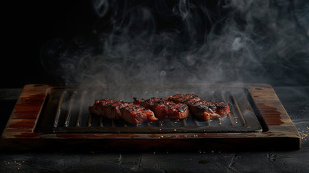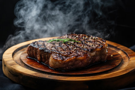 A photograph of a delicious steak on a wooden plate, set against a dark background with smoke, captured from a side view and perspective. High-resolution photography. --ar 3:2 --v 6.1 Job ID: 752a90e6-41de-45a4-9dcd-53944c41aa79