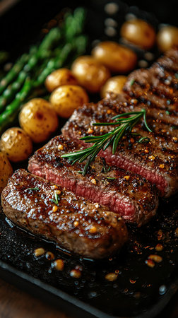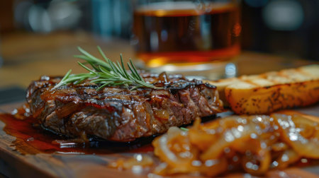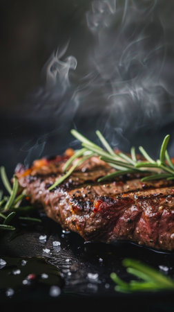 Closeup of a succulent grilled beef steak, seasoned with rosemary and served with a drizzle of balsamic sauce, presented against a dark background for a dramatic effect