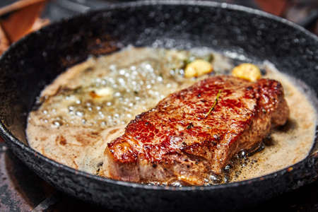 A tantalizing juicy steak sizzles in a hot pan with melted butter and fresh herbs, creating a mouthwatering culinary experience filled with flavor.
