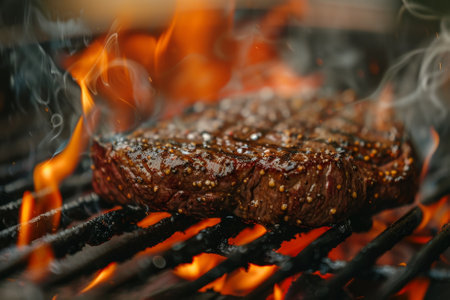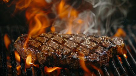 Juicy steak cooking over roaring flames, showcasing perfect grill marks. Ideal for food enthusiasts, this image captures the passion of grilling outdoors.